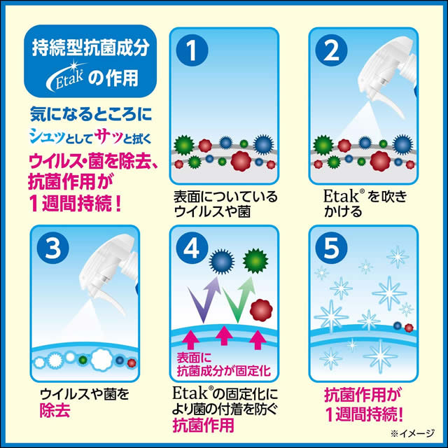 ◆スプレーした直後の抗菌作用だけでなく、抗菌成分が対象物表面に固定されるため、乾燥したあとも抗菌作用が1週間持続します。